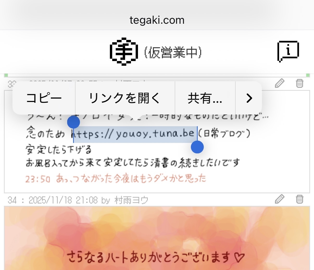 そういえば ↑手ブロ画面のスクショです一時的に手ブロにこちらのURLを手書きで置いていたんだけど、iPadや iPhoneからは手書きの文字もコピペできるし、選択か長押しでリンクも見つけてくれるからすぐアクセスできるし、手書きでURLを置いておくのもありだなと思った。PCや他機種のスマホはどうなのかちょっと分からないけど。